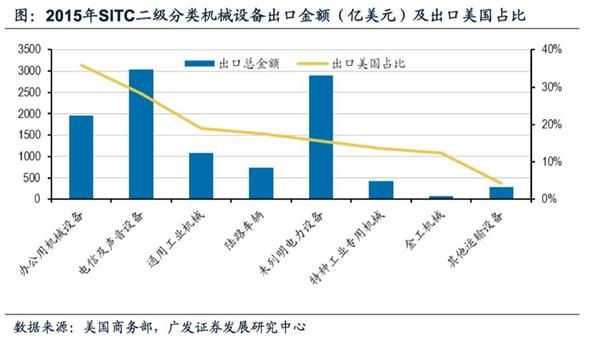 在此次美国政府公布的项目清单中,建议加征关税的主要包括航空航天、机器人、机械设备以及信息技术等行业,属于高端装备制造业。我们认为,美国此次301调查以机电设备为首主要基于以下几点: