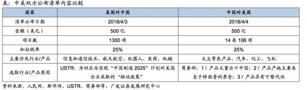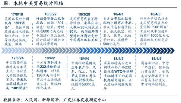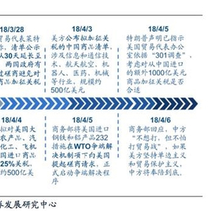 自3月22日特朗普对“301调查”结果签署备忘录以来,中美贸易战“再升级”:4月3日,美国政府公布拟加征关税的中国商品清单,目前处于公示期,如果最终实施,可能对中国输美的约1300项500亿美元规模的商品加征25%的关税;4月4日,中国政府及时做出对等反击:拟对原产于美国的大豆、汽车、化工品、飞机等14类106项500亿美元规模的商品加征25%的关税,最终是否实施可能取决于美方;4月5日,特朗普要求额外对1000亿美元中国进口商品加征关税;4月6日,商务部回应,中方将不惜代价采取新的综合措施应对中美贸易战。