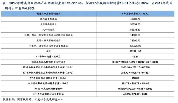 因此,若征税清单中主要用钢行业均不再向美出口,且我国不再向美国直接出口钢材,则最多影响钢材需求量372.72万吨,占2017年我国钢材销量10.31亿吨的0.36%,占2017年我国钢材出口量的4.96%。
