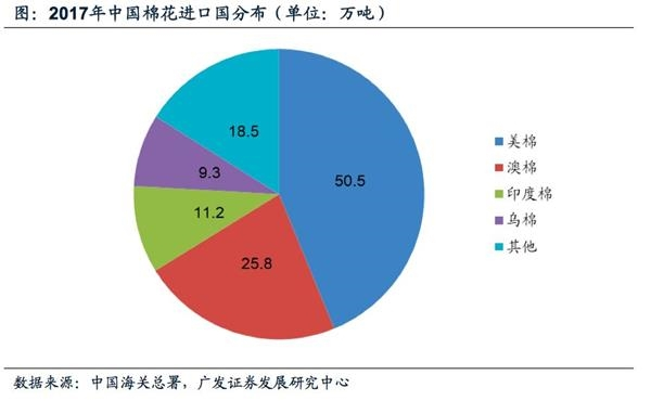首先,如果关税加征,短期会对每年进口有一定影响。根据海关数据显示,2017年全年我国累计进口棉花115.3万吨,同比增长28.93%,主要进口的是美棉50.5万吨、澳棉25.8万吨、印度棉11.2万吨、乌棉9.3万吨,其中美棉占比43.80%。根据中国棉花信息网的测算,加征25%的关税后,同价位美棉人民币折算价格相比1%关税下将上涨3400元/吨以上。短期一定程度上会影响进口,进而影响供给,对棉价有一定影响。
