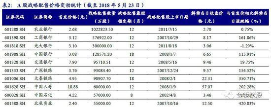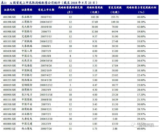 A股战略配售20年:近九成战略配售股解禁当日价格超过首发价。(1)截至2018年5月23日,A股共有45家公司在首发上市时采取了战略配售,最短锁定期平均值为13个月,战略配售股数占首发总股数的比例平均值为32.77%。2000年,战略配售热潮掀起,当年实行战略配售的公司高达20家。此后该业务步入探索及调整阶段,自陕西煤业2014年1月实行战略配售直至2018年5月工业富联上市,战略配售四年未有重启良机。(2)截至工业富联上市前,45家参与战略配售的A股公司中近九成解禁当日收盘价超过首发价格,中位数涨幅达81.05%,仅5家解禁当日收盘价跌破首发价格,另外共有19家公司解禁当日股价对首发价格涨幅超过100%,其中涨幅最大为中国国航(678.93%)。