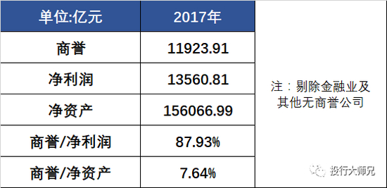 截至到2017年12月31日,全A股上市公司(剔除无商誉以及金融公司)的累计商誉为11924亿元,相比于2013年,增长了6倍。占净资产的比例高达7.64%,占净利润的87.93%。