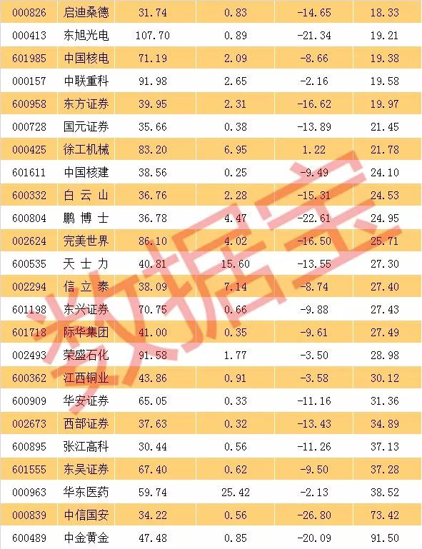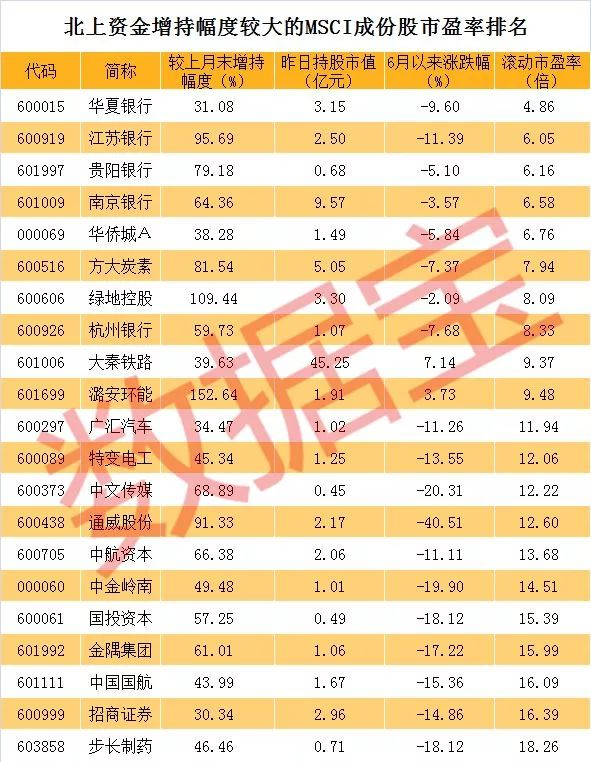 低估值的白马股依然是北上资金抄底的核心标的。6月以来下跌近10%的华夏银行,最新滚动市盈率只有4.86倍,北上资金增持31.08%。6月以来下跌11%的江苏银行,最新滚动市盈率6.05倍,北上资金增持95.69%。6月以来下跌5%的贵阳银行,最新滚动市盈率6.16倍,北上资金增持79.18%。此外,南京银行、华侨城A、方大炭素等7股市盈率低于10倍。