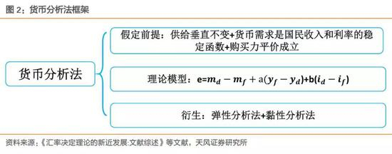 在货币分析法中,货币供需是核心,供给是外生的,需求由利率、产出决定,进而再由供需变化,产生物价变动,再通过购买力平价理论决定汇率变动。