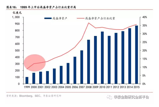1999年高盛在纽约证券交易所正式挂牌上市。上市前,高盛以合伙人制度经营和运作百余年。合伙人制度对于投资银行的治理和激励机制有独特优势。在治理方面,有设立简单、赋税较轻、合伙人直接参与管理等优点;在人才激励方面,合伙人可受到物质和精神的双重激励,有利于吸引优秀人才并保持长期稳定。但随着投资银行业的发展和金融工具的创新,短期高薪比长期等待成为合伙人对优秀一线员工更有吸引力,单纯的合伙人制度使高盛在人才竞争中难以取得优势。此外,当合伙人成为有限合伙人,市场波动影响公司盈利时,合伙人很可能大量撤资,高盛的资本结构和资本金的稳定性将面临巨大风险。因此高盛上市有激励机制的掣肘和人才竞争的压力,也有资本金和风险的压力。上市后,高盛资本结构稳定性得到改善,合伙人制度也并未消失,在集团内部,公司制和合伙人制度实现了完美的结合,形成了独特、有效且稳定的管理架构。高盛也成为了华尔街最后一家保持合伙人制度的投资银行。