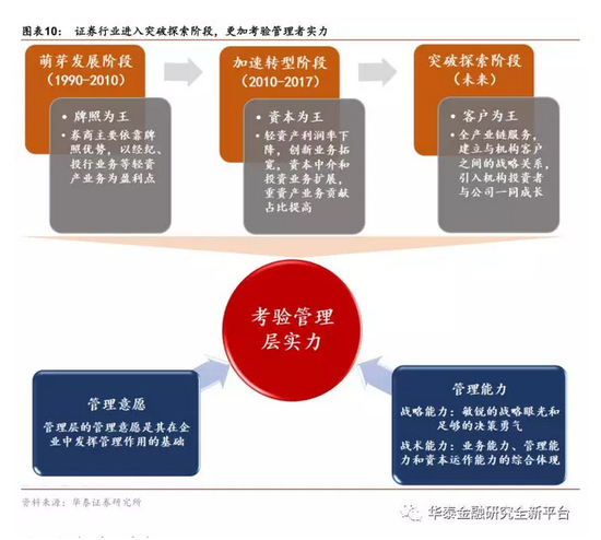 市场环境巨变,牌照红利弱化,唯有探索商业模式的升级方能穿越市场激荡巨变。当前股票市场趋于成熟,交易量趋于稳定,经纪业务佣金战压缩盈利空间,大资管统一协调监管下券商资管去通道方向明确。市场环境的种种变化让券商躺着挣钱时代一去不返,行业竞争加剧。行业盈利驱动从牌照红利及市场红利,向市场定价能力及风险管理能力发展演变。在牌照为王的时代,管理层更多是从行政管理的角度对证券公司进行领导,在当前突破与探索的新时期,公司的改革与发展对管理层的实力提出了更高要求。