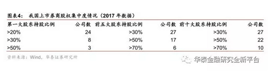 中国证券公司股权相对集中。2017年,我国28家上市券商第一大股东的平均持股比例达27%,24家公司第一大股东持股比例超过20%;前五大股东平均持股比例为55%,其中更有券商此项比例高达90%,前五大股东持股比例超过30%的公司有27家;前十大股东平均持股比例为64%,22家公司前十大股东持股比重超过50%。并且,我国证券公司中国资大比例控股较为常见,而国资下面会通过多个控股公司分别持有股权,这就造成实际控股人的平均持股比例在此基础上还将大幅升高。因此整体来看,我国证券行业股权集中度较高。