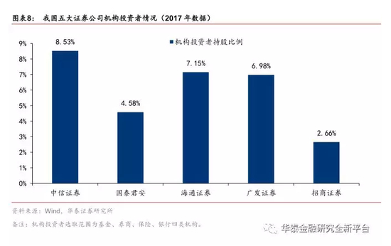 中国证券公司机构投资者持股比重较低。从2017年数据来看,我国五大证券公司机构投资者持股比例不超过10%,平均值为5.98%。其中,中信证券机构投资者持股比重最高,达8.53%,招商证券机构投资者持股比例最低,为2.66%。国泰君安、海通证券、广发证券机构投资者持股比例分别为4.58%、7.15%、6.98%。与美国几大券商超80%的机构投资者持股比例相比,我国证券公司的机构投资者持股比例仍有非常大的上升空间。