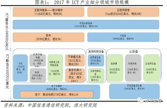 2017年全球ICT产业总体规模预计突破52000亿美元,其中ICT服务业达到34500亿美元,ICT制造业突破18000亿美元。站在细分领域的角度,集成电路、软件和IT服务、通信分别承担着信息的计算、加工处理和传输功能,这三类技术也成为各企业和各国竞争发展的重要高地。