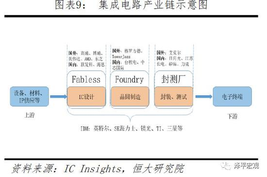 站在产业链的角度,集成电路可以分为设计、制造与封装测试三个环节,其中垂直一体化模式称之为IDM(Integrated Device Manufacture),以英特尔、三星为代表;专业化分工则可以分为Fabless(IC设计)、Foundry(晶圆代工)、封测,Fabless的核心是IP,以高通为代表;Foundry的核心是制程与工艺的先进性与稳定性,以台积电为代表;封测相对来说对技术的要求不如前两者。