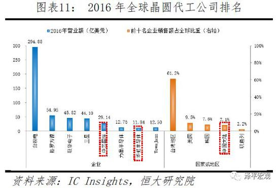 晶圆代工领域,全球前十大晶圆代工厂中,中国占据两席,中芯国际排名第四、华虹排名第八,总共市场份额达到7%;美国Global Foundries排名第二,市场份额11%。台积电为纯晶圆代工领域绝对龙头,市场份额达到59%。除了销售收入的差距,华虹最高水平制程只有90nm,主要产品都是为电源管理IC、射频器件芯片代工。中芯国际量产的28nm制程良率尚未完全稳定,而台积电已经导入10nm制程为苹果iPhone8的A11处理器、华为mate10的麒麟970等手机芯片代工,并且计划今年将量产7nm制程。从“28nm-20nm-14nm-10nm-7nm”的工艺升级路径来看,中芯国际与台积电的技术工艺水平差了三代。