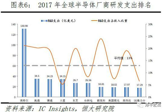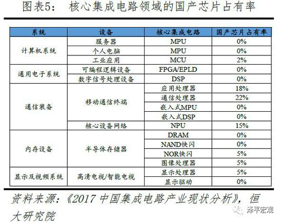 在诸多核心集成电路如服务器MPU、个人电脑MPU、FPGA、DSP等领域,我国都尚无法实现芯片自给。此次中兴事件,正是由于中兴在高端光通信芯片、路由器芯片等方面依赖博通等供应商,以至于一旦被美国制裁就将面临破产风险。对外依赖只是中国在核心芯片领域相当薄弱的外在表现,其实质是在集成电路的各核心产业链环节缺少足够的、长期的资本投入、研发投入与积累。2017年美国芯片巨头英特尔研发支出达到130亿美元、资本支出预计达到120亿美元,仅研发支出就已接近中国全部半导体企业全年的收入之和;高通、博通、英伟达等芯片设计厂商更是将20%左右的销售收入投入用于研发。国内集成电路制造领军企业中芯国际2016年资本开支26.3亿美元、研发投入仅3.18亿美元,如此悬殊的投入对比下,中美半导体领域的产出差距可想而知。