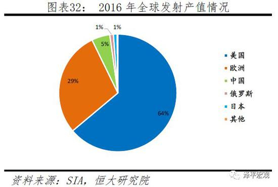 卫星发射方面,美国无论在发射数量还是发射收入都遥遥领先。2016年全球共计发射90次约350颗航天器,其中美国以27%的发射数量和64%的发射收入居首,而中国发射数量与产值均5%,排名第三。
