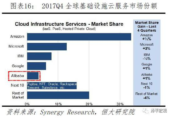 根据美国市场研究机构Synergy Research统计,目前全球基础设施云服务(IaaS+PaaS+托管私有云)市场中,亚马逊AWS市场占有率接近35%,其余为微软Azure、IBM、谷歌,阿里云排名第五,全球市场份额不到5%。