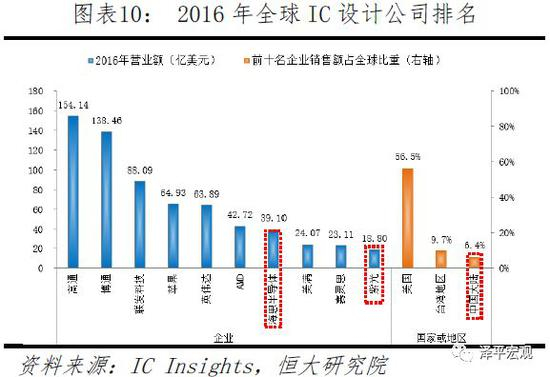 中国近年来在IC设计领域的进步不小。2010年全球前十大Fabless厂商中尚无一家大陆企业入围,除了台湾地区的联发科排名第五,其余九家均为美国企业。而2016年华为海思与紫光集团双双进入前十,大陆企业在IC设计领域的全球市场份额也由2010年5%左右提升一倍至约10%。同时美国企业份额则从69%下降至55%左右。尽管短期之内美国在IC设计领域的霸主地位难以撼动,但相对实力正在此消彼长。