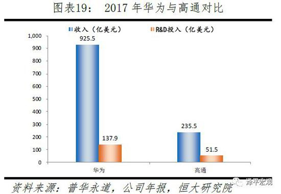 通信是信息社会的“神经网络”。当前全球四大通信设备巨头华为、爱立信、诺基亚、中兴,中国占据其二。华为2017年销售额925.5亿美元,研发投入137.9亿美元,大幅超越传统通信设备巨头爱立信与诺基亚。与美国无线通信巨头高通相比,华为的收入与研发投入体量同样领先。在过去十年内,华为在研发领域累计投入近4000亿人民币,目前拥有超过7万份专利(超过90%是发明专利)。