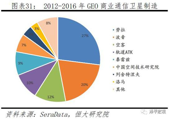 卫星制造与卫星发射对资金、人才、技术都具有高要求,全球参与公司或者政府部门约为30个,其中,欧美六大制造商占80%以上的市场份额。以GEO商业通信卫星制造订单为例,美国波音、劳拉、轨道ATK与洛马占62%,垄断过半市场。