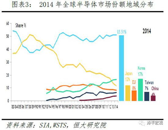 全球半导体产业市场规模已经从1996年1320亿美元增长至2017年4122亿美元。根据美国半导体行业协会(SIA)的统计,按照半导体企业总部所在地分类,目前美国公司占到全球半导体市场份额的一半左右,其次为韩国、日本,中国目前市场份额在5%左右。