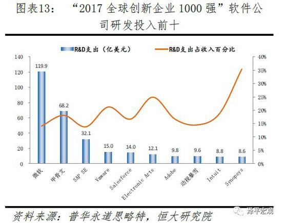 根据普华永道思略特发布的“2017全球创新企业1000强榜单”,其中软件与互联网服务公司按照研发投入排名的创新十强榜单中,中国凭借BAT占据第7、第8及第10名,前五名清一色为美国企业——亚马逊、谷歌、微软、甲骨文、Facebook。美国前三强软件与互联网服务公司亚马逊、谷歌、微软的研发支出均超过百亿美元,相比BAT中最高的阿里巴巴也仅达到25亿美元。