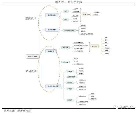航空航天均是高端综合性工程技术、理论学科和实际应用的结合,其中航天科技可以分为空间技术、空间科学和空间应用。从整个产业链角度来看,空间技术集中在航天器制造和发射,空间应用集中在地面设备和运营应用,空间科学是基于两者去太空探索新知识,三者相互支撑相互依靠。