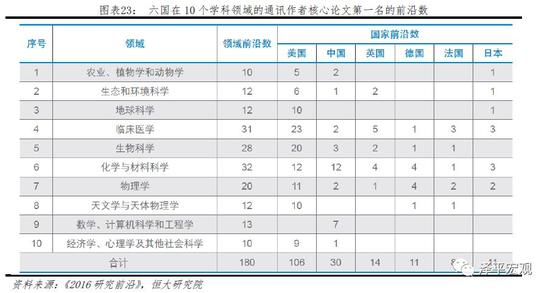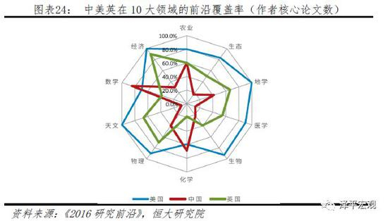 与航天相关性强的天文学与天体物理、物理学等基础研究较为薄弱。根据中国科学院科技战略咨询研究院《2016研究前沿》显示,从Essential Science Indicators(ESI)数据库的上万个研究前沿挑选出的共180个重点热点前沿为基础来分析10大学科中各国与所在国相关科研机构对重点热点前沿产出论文数量和论文影响力,在物理学的20个热点前沿领域美国引领数达到11个,中国仅2个;在天文学与天体物理的12个热点前沿领域,美国引领数达到10个,中国尚无斩获。