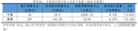 2)研发投入不够使得许多预先工作做得不深入不彻底,费用仅为美国的八分之一。从数据来看,无论是相对值还是绝对值,我国在航天航空预算方面都远不如美国。以航天为例,我国预算为美国的十分之一,如果加入美国国防航天部分的预算,则差距进一步扩大。此外,除了政府高额度拨款,美国航天事业约20%资金来源资本投资,占全球航天VC/PE的约65%。