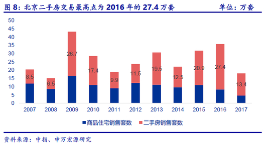 2016年是北京房地产市场最活跃的一年,全年成交是十年来最高点,27.4 万套,换手率4.7%。2017 年北京重新收紧调控,加强限购,对应的是成交腰斩。
