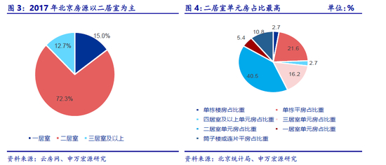 根据北京统计年鉴2017 年对全市居民居住户型的统计,一居室占比21.6%,二居室占比40.5%。与2017 年云房网统计的北京出租房源中二居室占据了最大份额相吻合,然而另一方面对于租房人来说,一居室却是他们最关注的户型。