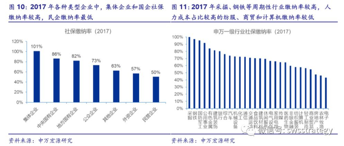 三、社保缴纳率方面,国企明显高于民企,受益于供给侧改革的周期型企业缴纳率较高,而人力资本密集型缴纳率较低