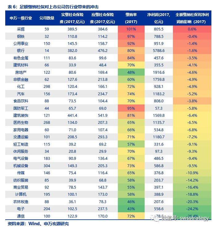 经测算,如果足额缴纳社保将给2017全部A股和非金融石油石化A股分别造成5.5%和5.7%的利润冲击;