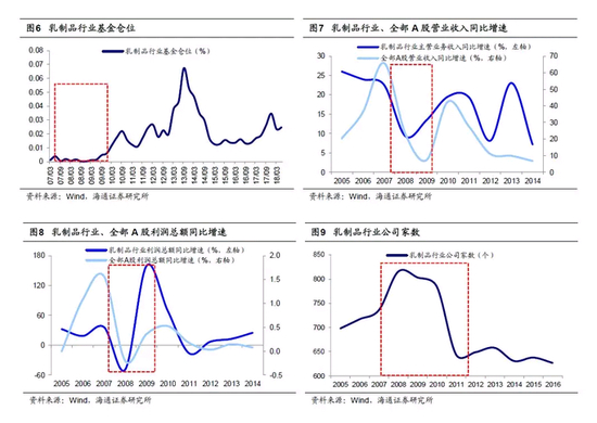 事件促发乳制品行业洗牌,行业盈利与集中度双提升。三聚氰胺事件使得消费者对国产乳企的信任跌入谷底,随之婴幼儿奶粉进口量呈现爆发式增长,市场普遍担心国内乳企是否从此便一蹶不振。十年后回看,三聚氰胺事件促使国家加快出台相关行业政策规范,2008年11月国家发改委等联合发布《奶业整顿和振兴规划纲要》,要求年底前,对乳品生产、收购、加工等各环节进行全面整改,并使各环节基本恢复到正常状态,中央财政将一次性下达补贴资金补贴奶农,对陷入困境的乳企将给予财政扶植。2009年6月工信部与发改委联合发布《乳制品工业产业政策(2009年修订)》。新政策最大的变化在于,新建乳制品项目可控奶源占比从30%提高至40%,大幅提高了奶业企业扩张成本。同时,还原奶彻底被禁。政策规范下乳制品安全问题得到有效遏制,行业重回健康发展轨道,全国乳制品行业主营收入从2008年的1431亿元增长至2014年3298亿元,年化复合增速14.9%,利润总额从40亿元增长至225亿元,复合增速33.2%,而同期全部A股收入年化复合增速16.9%,利润复合增速20.9%。从行业结构看三聚氰胺事件使乳制品行业出现洗牌,事件直接相关企业三鹿集团在2009年被三元集团收购,行业准入门槛提高,上市龙头企业凭借资金实力和研发投入,在后续市场中不断提高市占率,抗风险较弱的中小企业逐渐萎缩甚至退出,2008年整个行业的企业数量达到了峰值的815家,2016年仅剩下627家。从股价看三聚氰胺事件是乳制品行业熊市中的最后一跌,包括蒙牛、伊利在内的多家乳制品企业股价在此后十年均不断创下新高。2008年10月至今,蒙牛、伊利、光明股价分别上涨685%、2205%、175%,而同期上证综指、万得全A仅上涨51%、173%,而当时逆市上涨的三元股份则在随后十年中因经营疲弱,股价至今反而下跌-6%。事件过后基金开始重新建仓,乳制品行业基金持仓由08Q4的0%(0%分位)回升至09Q1的0.09%(46%分位),此后持续加仓至13Q3高点6.7%(97%分位)。