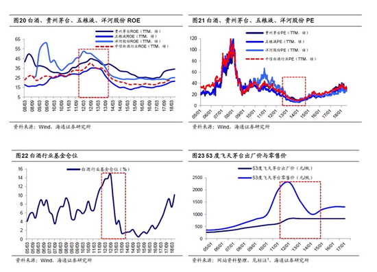 塑化剂事件后限制三公政策出台,白酒行业进入深度调整阶段。和三聚氰胺事件不同的是,白酒塑化剂事件对行业基本面并未形成太大冲击,多家酒企都辟谣不存在塑化剂问题,有官员也表示塑化剂的安全标准在世界各国并无统一定论。但随后12年底出台的限制三公消费的政策却给白酒业带来重创。12月4日中央出台关于改进工作作风的八项规定,12月24日中央军委发布“禁酒令”。限制三公使得白酒政务消费大幅缩减,销量下滑、库存堆积、价格调减成为随后三年的行业主旋律。飞天茅台价格从12年高点2300元跌至14年1000元左右。前期酒企大幅扩张的产能成为拖累,白酒行业归母净利累计同比增速从12Q3的62.0%降至14Q1的-22.5%,ROE从40.4%降至23.7%;茅台归母净利同比从12Q3 58.6%降至14Q3 -3.4%,ROE从45.0%降至32.3%;五粮液归母净利同比从12Q3 61.9%降至14Q3 -33.7%,ROE从35.0%降至14.8%。从12年7月12日高点到14年1月9日低点,白酒行业指数下跌-58.6%,茅台-51.9%、五粮液-59.8%、洋河-73.6%,上证综指-7.2%。估值方面白酒行业PE(TTM)从12年7月高点27.3倍(15.9%分位)持续降至14年初8.5倍(0.1%分位),茅台从27.0倍(32.0%分位)降至8.9倍(0.1%分位)、五粮液从20.2倍(11.3%分位)降至6.1倍(0.3%分位)。抱团取暖失败,基金重仓股中白酒持仓占比从12Q2的13.9%(93.9%分位)降至12Q4的8.8%(69.6%分位),随后继续降至13Q4的1.4%(5.4%分位)。