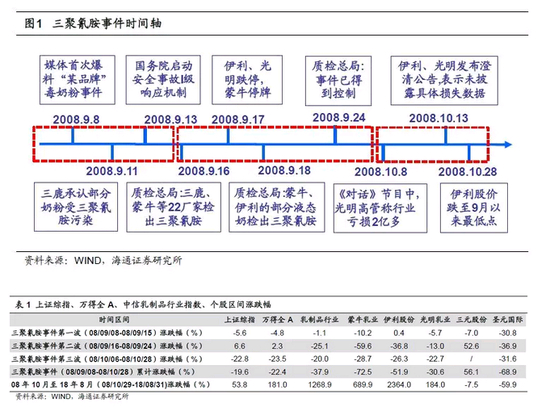 三聚氰胺事件一波三折,相关龙头公司股价腰斩。与多数行业突发事件类似,三聚氰胺事件经历了“媒体报道”—“官方介入”—“更大范围报道与渲染”的过程。事件一开始关注度不高,市场反应也是波澜不惊。2008年9月8日,甘肃《兰州晨报》等媒体以“某奶粉品牌”为名,爆料毒奶粉事件。9月11日晚,三鹿发布产品召回声明,承认部分批次三鹿婴幼儿奶粉受三聚氰胺污染。事件第一波(9/8-9/15)市场并没有做出反应,期间中信乳制品指数-1.1%,蒙牛-10.2%,伊利上涨0.4%,光明下跌-5.7%,三元-7.0%,上证综指-5.6%。第二波发酵起于9月16日晚国家质检总局公布三鹿、蒙牛、伊利、光明、圣元等22个厂家的奶粉检出三聚氰胺。当日蒙牛股价下跌-0.7%,伊利-6.0%,光明-7.9%,圣元-54.5%,17日伊利、光明双双跌停。9月18日晚质检总局公布蒙牛、伊利、光明的部分液态奶也检出三聚氰胺,而三元、雀巢液态奶产品未检出三聚氰胺,事件影响进一步扩大。事件第二波(9/16-9/24)蒙牛下跌-59.6%,伊利-36.8%,光明-13.0%,圣元-36.9%,而未检出三聚氰胺的三元股份则上涨52.6%,同期上证综指上涨6.6%。大跌之下24日光明乳业大股东宣布增持100万股,25日伊利股份也发布公告称问题批次产品清理工作已全面结束,合格产品全面恢复上架销售,两只股票勉强止跌。但事件并未就此结束,“十一”期间媒体与公众对毒奶粉事件越发关注,10月12日晚央视《对话》节目中主持人预测三聚氰胺事件致三家企业损失超2亿元,随后光明乳业总裁郭本恒称:实际损失不止这些。这一说法加剧了市场对基本面的担忧,虽然13日晚伊利、光明均发布澄清公告,表示从未披露具体损失数据,但都预计当年第三季度亏损。在事件第三波(10/6-10/28)蒙牛下跌-28.7%,伊利-26.3%,光明-22.7%,圣元-31.6%,同期上证综指跌幅-22.8%。回头看整个事件发生过程,期间(09/9/8-10/28)乳制品行业指数下跌-37.9%,同期蒙牛-72.5%,伊利-51.9%,光明-30.6%,圣元-68.9%,上证综指下跌-19.6%。