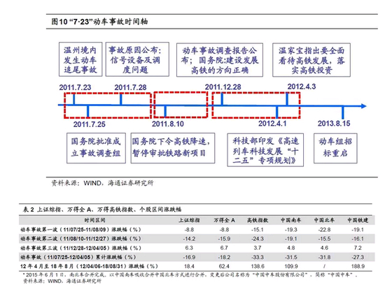 温州动车事故短期重创高铁概念股。2011年7月23日浙江温州境内发生动车追尾事故,造成40人死亡、172人受伤,25日国务院批准成立事故调查组。7月25日周一万得高铁指数下跌-5.8%,中国南车-8.9%,中国北车-9.7%,天马股份等6只高铁概念股跌停。7月28日,上海铁路局公布事故调查结果:信号设备及调度问题致动车追尾。同日时任国务院总理温家宝前往事故现场,悼念遇难者。虽然“高速运行”并非事故主因,但市场对高铁发展进程已出现担忧,事件第一波(7/25-8/9)高铁概念股受到重创,期间高铁指数下跌-15.1%,中国南车-19.3%,中国北车-22.8%,中国铁建-19.1%,上证指数-8.8%。8月10日,国务院常务会议决定适当降低高铁运行时速,重新评估尚未开工的铁路项目,暂停审批新项目,至此自2008年开始高速迈进的铁路建设进入实际减速慢行阶段,事故影响从个案事故升级至行业基本面预期调整,股价继续深度回调,事件第二波(8/10-12/27)高铁指数下跌-24.3%,中国南车-19.1%,中国北车-15.5%,中国铁建-16.1%,上证综指同期-14.2%。12月28国家安监总局公布事故调查报告,国务院常务会议宣布对铁道部相关人员严肃追究,至此事故调查宣告结束。2012年4月1日科技部印发《高速列车科技发展“十二五”专项规划》,4月3日温家宝调研时强调要全面看待我国铁路与高铁的发展,确保铁路投资到位,市场情绪逐渐恢复,事件第三波(2011/12/28-2012/4/5)高铁指数上涨3.7%、中国南车4.8%、中国北车4.6%、中国铁建7.2%,同期上证指数上涨6.3%。整个事件过程中(2011/7/25-12/4/5),高铁指数最大跌幅-40.5%,中国南车-38.3%,中国北车-36.9%,中国铁建-36.3%,上证指数-23.0%。
