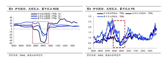 三聚氰胺事件爆发前市场疲弱,乳企行业基本面已在恶化。2008年9月三聚氰胺事件爆发之前,股市已经经历了一年多熊市,上证综指从2007年10月高点6124点跌至2008年9月事发前的2202点,跌幅达64%。回看事件爆发前的基本面表现,2006年玉米价格上行推升饲料价格上涨,国际奶粉价格上涨使得部分食品、饮料企业转向国内抢购原奶,致使2007年下半年开始国内原料乳及乳品价格全面上涨,乳品企业盈利出现下滑。伊利股份扣非后归母净利润累计同比在06Q4见顶回落,从28.6%降至事发前08Q2的-68.3%,ROE(TTM,下同)从06Q3高点13.7%降至08Q2的-3.3%;光明乳业事发前连续12个季度扣非后归母累计净利同比负增长,08Q2为-91.7%,ROE为10.5%;蒙牛扣非后归母净利累计同比在06Q4见顶回落,从51.8%降至事发前08Q2的21.7%,ROE从24.3%降至20.3%。盈利恶化导致PE失效,用PS观察个股估值变化,伊利股份PS(TTM)从2007年10月牛市高点1.0倍(历史自下而上47%分位,下同)降至08年9月事发前0.5倍(8%分位),光明乳业从2.0倍(90%分位)降至事发前0.7倍(12%分位),蒙牛从2.6倍(100%分位)降至1.5倍(63%分位)。对于这样的基本面恶化趋势,基金持仓也做出反应。基金重仓股中乳制品占比从07Q2的0.36%(80%分位)降至08Q2的0.13%(67%分位)。整体看,三聚氰胺事件爆发前,乳制品行业无论从股价还是基本面看都是低迷的。