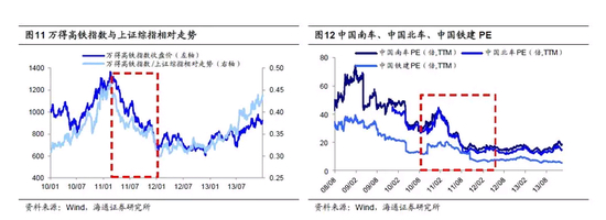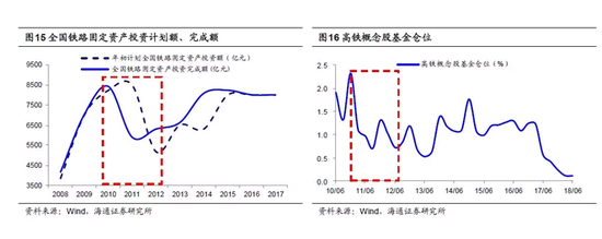 2008-10年高铁建设高速迈进,11年2月铁道部人事变动,事故爆发前股价已在回落。作为2008年政府四万亿投资重点,中国铁路固定资产投资额从2008年的4168亿元翻倍至2010年的8427亿元,受益于铁路投资高增长,高铁相关概念股盈利持续向好,中国南车扣非后归母净利润累计同比从09Q1的-49.8%上升至事故前11Q1的169.1%,ROE(TTM,下同)从7.5%升至16.5%;中国北车净利同比从09Q4的-14.7%上升至11Q1的138.6%,ROE从10Q2低点7.4%升至11Q1的10.1%;中国铁建在08-10Q2期间也保持了50%以上的净利累计同比增速, ROE维持在8%-15%区间。基本面改善推动股价上行,2008年初-2011年1月底高铁指数上涨27.5%,中国南车166.5%,中国北车69.6%,中国铁建下跌-29.7%,上证指数-47.0%。行业转折点发生在2011年2月原铁道部部长免职,新任铁道部部长4月提出了“保在建、上必需、重配套”的高铁建设方针,5月初铁道部下调2011年铁路基建投资额,较之前计划减少14%。龙头个股基本面也在11Q1到达高点后出现下行,中国南车11Q2/11Q1扣非后归母净利润累计同比为 86.6%/169.1%,中国北车103.0%/138.6%,中国铁建9.1%/26.1%。人事变动与铁路投资计划缩减使得高铁概念股深度回调,11年1月底到7月动车事故爆发前高铁指数下跌-16.3%,中国南车-26.5%,中国北车-31.8%,中国铁建-26.4%,上证指数-0.7%。从估值看中国南车PE(TTM)从10年9月低点27.6倍(历史自下而上21%分位,下同)升至11年1月高点43.9倍(52%分位),又降至7月事发前25.2倍(15%分位);中国北车从25.8倍(34%分位)升至44.4倍(100%分位),再降至23.8倍(24%分位);中国铁建从11.6倍(5%分位)升至20.5倍(44%分位),再降至15.6倍(25%分位)。高铁建设属于国家长期支持战略,2010年底基金重仓高铁概念股,持仓比例2.3%。11Q1减仓至1.1%。回溯看动车事故之前,因铁道部人事变动、投资计划缩减,高铁概念股已下行近半年,基金已在减持。