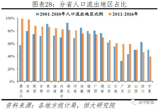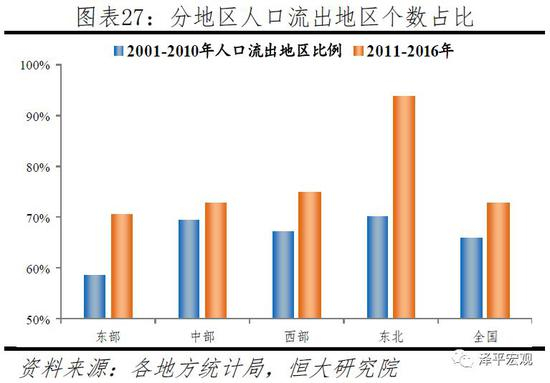 分地区看,东北地区人口流出地区个数占比从70.1%增至93.7%,中西部地区从68.1%增至74.2%,东部地区从58.6%增至70.6%。东部地区人口流出地区个数从2001-2010年的285个增至2011-2016年的343个,占比从58.6%增至70.6%;中部地区人口流出地区个数从2001-2010年的380个增至2011-2016年的399个,占比从为69.5%增至72.9%;西部地区人口流出地区个数从2001-2010年的584个增至2011-2016年的652个,占比从67.2%增至75.0%;东北地区人口流出地区个数从2001-2010年的122个增至2011-2016年的163个,占比从70.1%增至93.7%。分省看,扣除直辖市和缺失数据较多的新疆、西藏、青海、江西、山东、河北以及区县级人口数据质量较差的辽宁,当前黑龙江、吉林接近全境人口流出,然后依次为陕西87.4%、甘肃86.4%、贵州85.9%,较低的三个是宁夏的38.9%、四川的45.9%、山西的50%。