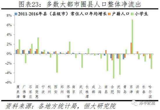 从都市圈内部看,除广佛肇、厦漳泉、京津外,多数大都市圈内的县(县级市)人口整体净流出,表明人口当前仍主要向多数大都市圈内中心区域集聚。绝大多数县及县级市为五六线城市,2011-2016年全国地级市辖区以外的县市常住人口年均增速为0.25%,远低于同期全国总体平均水平0.51%。除去县(县级市)常住人口缺失的京津、济南、长春、哈尔滨等4个大都市圈,2011-2016年19个千万级大都市圈的县(县级市)常住人口年均增速也仅为0.28%,这意味着多数大都市圈仅市辖区人口流入。粗略地与本省人口自然增长率相比较,2011-2016年这19个千万级大都市圈中县市常住人口净流入的仅有厦漳泉、广佛肇,年均增长率分别比本省自然增长率略高0.04、0.06个百分点;石家庄、深莞惠、苏锡常的县市人口年均增长率则分别比本省低0.04、0.05、0.05个百分点,基本接近流入流出平衡。此外,京津都市圈县(县级市)常住人口数据缺失,但2011-2016年县(县级市)户籍人口、小学生人数年均增长率分别高达2.3%、7.1%,常住人口很可能在流入,这主要由于在北京工作的部分人口居住在环京地区。
