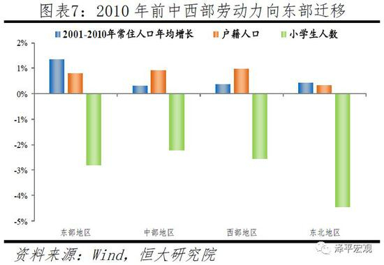 2010年左右以来,部分人口回流中西部,东部地区面对用工压力主动推进大学毕业生、技能人才等外来人口本地化,户籍人口和小学生增速明显加快,东北地区人口加速流出。2009年在长三角和珠三角地区务工的外出农民工占全国外出农民工比例分别比上一年下降2.4%和7.6%,2009年下半年东部沿海地区出现明显的“用工荒”;2013-2017年高校毕业生在东部地区就业规模虽持续增长,但占比从65.7%降至56.7%(参见麦可思研究院《中国大学生就业报告》)。面对用工压力,东部地区主动深化户籍制度改革、吸引外来人口安居乐业。2011年起以鞋服产业闻名全国的晋江在福建率先实行零门槛“居住证”制度,并于2013年率先实行“无房也落户”政策。在2014年国务院要求进一步推进户籍制度改革后,2015年福建宣布全面放开除福州、平潭、厦门外地区的落户限制;广东宣布,除广州深圳外,放开直系亲属投靠,放宽大专以上(含大专)学历毕业生及技能人才、特殊专业人才入户条件等。2011-2016年,东部、中部、西部、东北地区常住人口分别年均增长0.75%、0.48%、0.63%、-0.06%,常住人口占比分别变化0.4、-0.2、0.1、-0.3个百分点。尽管东部地区常住人口增长率明显下降,但其户籍人口和小学生增长率却不降反升。2011-2016年,东部、中部、西部、东北地区户籍人口分别年均增长0.84%、0.58%、0.53%、-0.44%,户籍人口占比分别变化0.5、0、-0.1、-0.5个百分点。东部、中部、西部、东北地区小学生数分别年均增长2.32%、-1.10%、-1.25%、-2.64%,小学生数占比分别变化4.9、-1.9、-2.2、-0.8个百分点。其中,2014-2016年东部地区在常住人口年均增速较2011-2013年下降0.06个百分点,但户籍人口年均增速反而上升0.29个百分点。