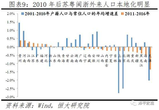 分省看,2010年后苏粤闽浙等东部省份外来人口本地化明显,鄂川皖湘桂等传统民工输出大省人口回流明显,黔豫冀等传统民工输出大省也有所回流,东北三省中黑龙江人口形势最为严峻。2011-2016年,户籍人口与常住人口的年均增速差为正的有贵州、河南、江西、江苏、广东、福建、河北、浙江等少数省份。其中,贵州、河南、江西、河北为传统农民工输出省份,2001-2010年户籍人口年均增速均高于常住人口增速,2011-2016年只是延续这一态势,但户籍人口与常住人口的年均增速差收窄表明外出劳动力有所回流。人口回流更为明显的则是湖北、重庆、四川、安徽、湖南、广西等省,常住人口增长于2011-2016年超过户籍人口增长。而江苏、广东、福建、浙江在2001-2010年户籍人口年均增速均小于常住人口增速,表明大量吸引外来人口流入;2011-2016年户籍人口年均增速开始大于常住人口年均增速,表明外来人口户籍本地化。与此同时,2011-2016年江苏、广东、福建、浙江等东部省份的小学生数年均增速明显高于接近0的全国平均增速,表明大量外来人口在东部定居后逐渐随迁子女到当地入学。此外,东北三省中黑龙江、吉林省常住人口、户籍人口增速在2011-2016年均转负,辽宁常住人口接近0增长、户籍人口增速转负,黑龙江的小学生数增速更为全国倒数第一。