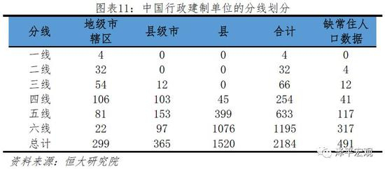 我们在《中国人口大迁移》中将338个地级及以上行政单位划分为一二三四线城市。为更准确把握人口流动,本文以地级以上城市市辖区、县、县级市为基本单元,把中国内地2850个县级行政单位进一步细分为2184个地区,并依据GDP、政治地位、常住人口等因素划分为一二三四五六城市。由于重庆市辖区范围太大,我们将其特殊处理为主城九区和非主城九区市辖区两部分,这使得地级及以上城市市辖区增加1个至299个。