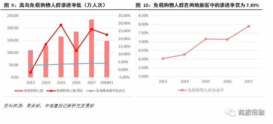 离岛免税购物渗透率低。至2018年H1,离岛免税购物人数在海南省游客数中占比仅有4.05%。考虑到目前的两大免税店主要只能覆盖三亚市以及海口美兰机场客流,测算出免税购物人群在两地旅客中的占比仅为7.89%。其中,三亚海棠湾免税店的进店购物人数达到131万人次,在三亚过夜游客中占比仅7.15%。较低的占比表明未来购物人数仍有较大的提升空间。