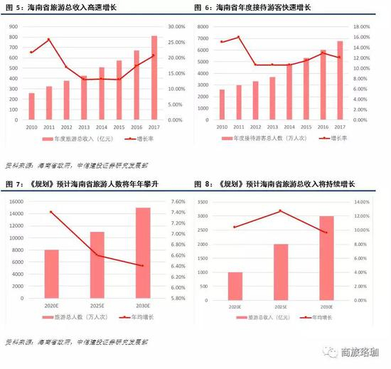 海南国际旅游岛的建设将进一步推动海南旅游业发展。海南省政府《规划》中预计,未来海南在2020、2025、2030年间的旅游人数年均增速分别为7.4%、6.6%、6.4%;旅游总收入年均增速分别为10.4%、12.7%、9.6%。