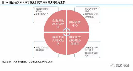 离岛免税政策从目的上是为加快推进海南国际旅游岛的建设发展,是完善海南国际旅游岛业态的一环。2018年4月,国务院重磅发布了《关于支持海南全面深化改革开放的指导意见》,提出了要建设贸易自由试验区、实行自由贸易港政策的全面开放新格局,赋予海南新的战略定位,对贸易、基建、交运、生态、旅游等多个板块构成直接利好。随着政策红利释放,海南省的“旅游”属性将不断强化,叠加投融资促进行业快速成长,未来海南各旅游产业具有广阔发展空间。