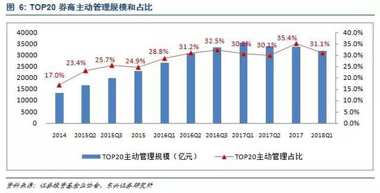 根据证券投资基金业协会的数据,以主动管理规模排名前20的券商口径来计算,实际上主动管理规模的占比在2014-2016年区间曾有所增长,从17%增长至30%左右的水平。我们认为该区间的增长主要来源于两方面: