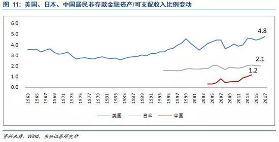 个人资金的潜在增量方面,我们使用居民非存款金融资产/可支配收入作为比较指标来衡量美国、日本和中国的情况。2015年最新数据我国该指标仅为1.2,远小于美国的4.8(2017)和日本的2.1(2016),未来向上的空间十分广阔。目前该指标依然处于较快的上升趋势之中,未来随着我国居民收入的不断增长,以及该指数的不断抬升,来自个人的金融资产投资需求将具有长期的增长潜力。