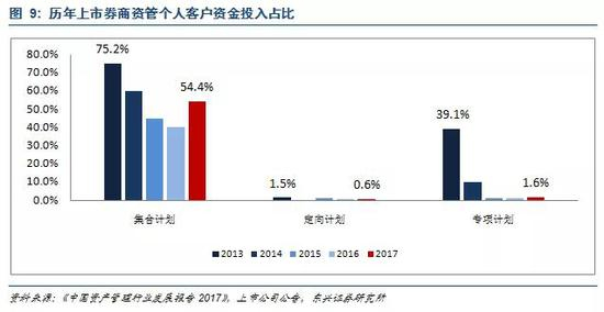 个人客户资金,主要是在集合计划中个人客户资金占比较高,但随着2015年以来市场的冷淡,以及机构委外的增长,个人客户的占比逐年下滑。已经由2013年的超过75%下滑至2016年的40%左右。但个人客户资金占比在2017年大幅度提升至54.4%。一方面是由于机构资金的减少(应对资管新规提前处置,增加流动性)另一方面是2017年的结构牛市提升了个人投资者的认购需求。