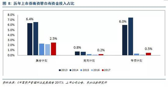 整体来看券商资管的资金来源有三方:自有资金、机构客户、个人客户。长期来看券商资管的资金来源基本以机构资金为主,2017年上市券商资管计划中机构客户资金整体占比超过90%。