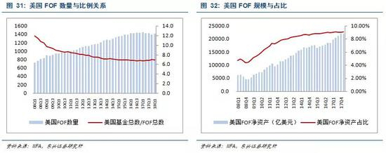 美国的FOF数量在2018Q1为1427只,基金数量与FOF数量的比例大约为7:1,也就是每7只公募就对应一只FOF。FOF净资产占整体基金行业的比例在9%左右。
