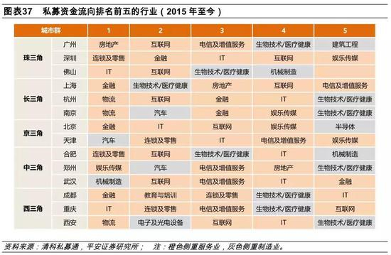 第三,互联网和IT行业是每个城市群都涉及的重点投资领域;珠三角、长三角、京三角等老牌城市群的金融属性比较明显,各城市群流向金融业的资金都颇具规模;除此之外,各城市也具备一些资金聚集的特色行业:广州的建筑工程业,杭州和南京的物流业,天津的汽车业,成都的教育与培训业,西安的电子与光电设备业。